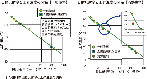 「熱交換塗料ネオコート」では、日射反射率が支配する上昇温度の関係より低い上昇温度を示した。
