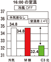 | 12:00にはM棟、C棟の熱交換塗料塗装の有無の差が2.5℃あらわれ、熱交換塗料塗装の効果が発揮されている。 | 14:30には外気温がピークとなり、室温も上昇するが、熱交換塗料塗装の有無の差は2.3℃保たれている。 | 16:00には冷風がONになっているが、M棟の室温は外気と同じまで高くなり、M棟、C棟の室温差は2.4℃となっている。 |